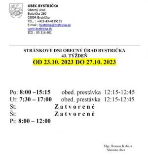 Oznamujeme občanom, že v 43. týždni bude zmena v stránkových hodinách obce z technických príčin. Ďakujeme za pochopenie.