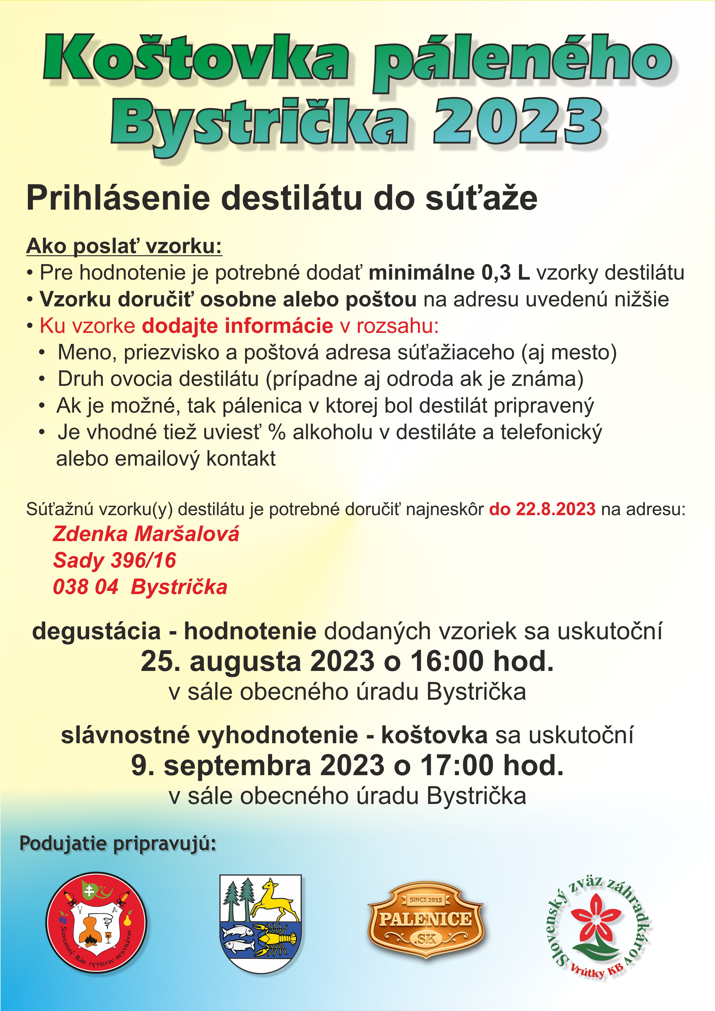 Prihlásenie destilátu do súťaže Koštovka páleného Bystrička 2023