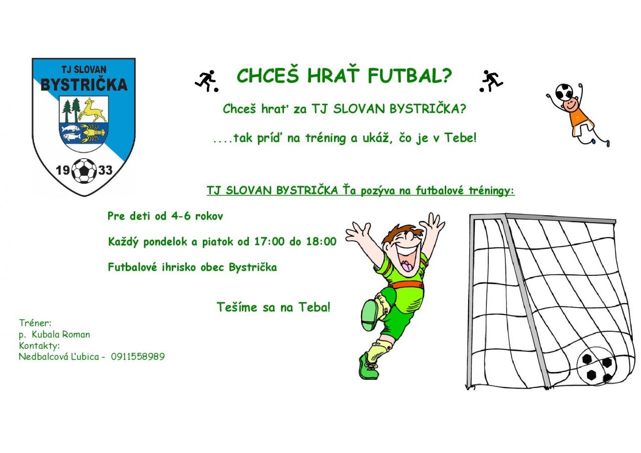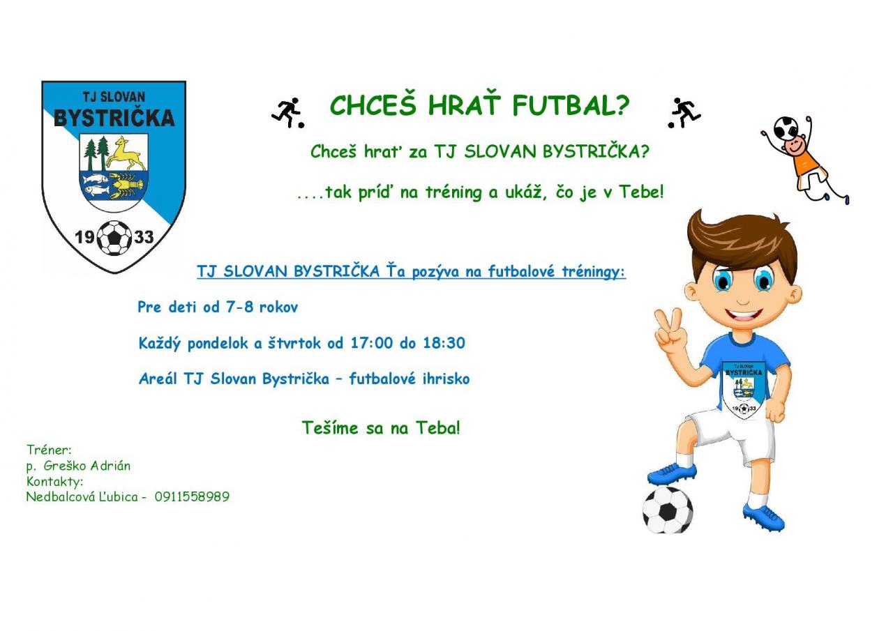 Termíny tréningov futbalovej predprípravky nájdete v priložených plagátoch. Benefity futbalu : budovanie imunitného systému, vytrvalosti, kolektívnosti..... Radi privítame deti a ich rodičov na zoznámenie sa so športovým prostredím a trénermi, v peknom vynovenom areáli TJ Slovan Bystrička, v blízkosti mesta. Ste srdečne vítaní.